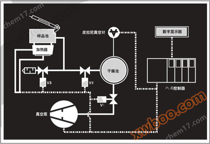 The layout of the HSYCAN II vacuum system is shown in the "schematic diagram". It includes: vacuum pump, drying tank (used to remove residual moisture in the vacuum system), solenoid valves (V1, V2, V3), sample tank, and Pirani vacuum gauge.