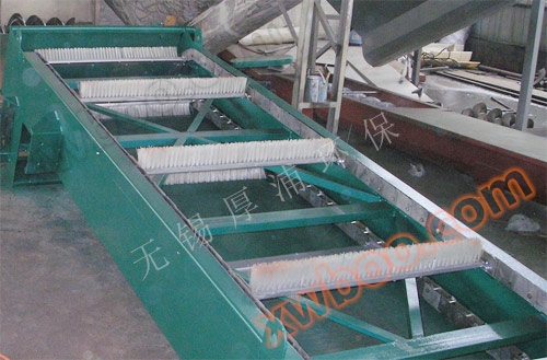 The WBF rotary brush mesh grate cleaning machine is mainly composed of a driving device, a frame, a spindle, a mesh, a slag plate, a fixed plate brush, a rotary brush, and a traction chain. Under the drive of the motor, the sprocket and chain are driven by the reducer to move, and the plate brush fixed on the rotating chain moves along the mesh surface from bottom to top, cleaning the mesh surface and taking away the dirt. When the dirt is transported to the top, most of it falls to the slag discharge by gravity, and a small amount of dirt attached to the fixed plate brush is removed by the rotating brush, completing the cleaning process. The liquid flows through the gap of the mesh, and the entire working process continues.